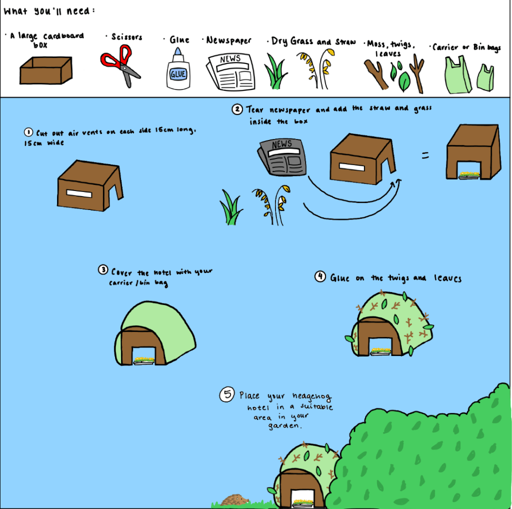 As a final year Zoology student, and using my knowledge working in the animal industry and other examples of hedgehog houses made by other people, I created one of my own designs and named it ‘The Hedgehog Hotel‘.